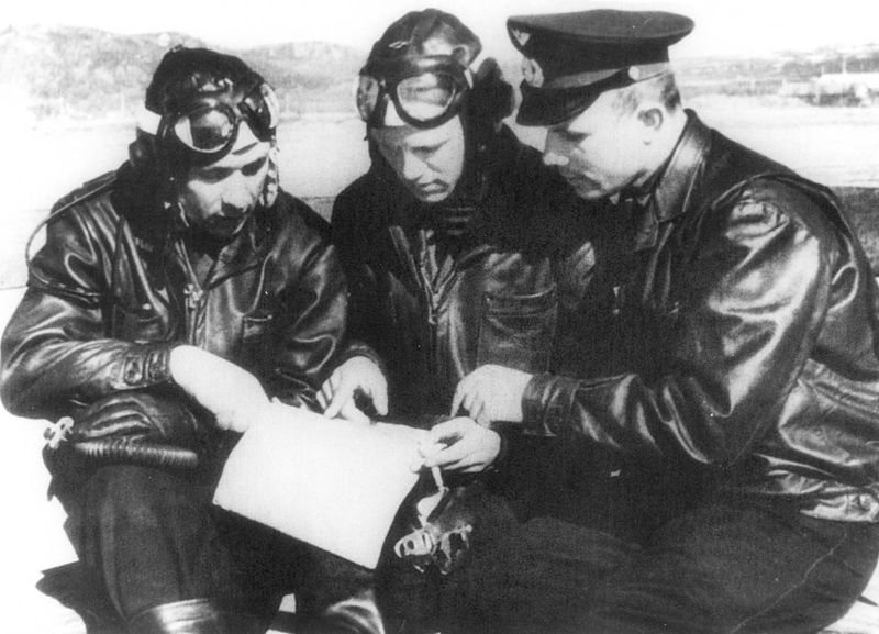 Подготовка к очередному полету. Три друга: Иван Доронин, Юрий Дергунов, Юрий Гагарин. 1959 г. ~ Архив С. Н. Дащинского