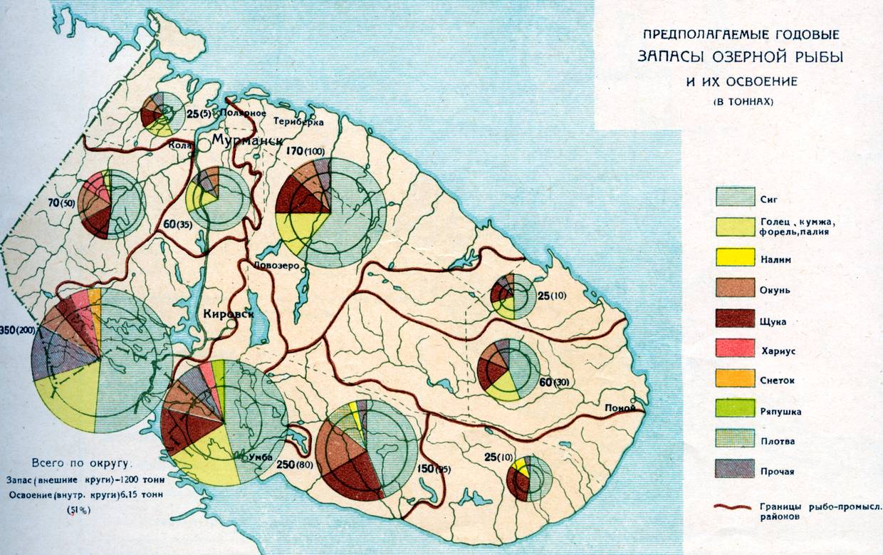 Предполагаемые запасы озерной рыбы в 1934 ~ Источник: "Экономический атлас Мурманского округа Ленинградской области", издание ГЭНИИ ЛГУ и Мурманского Окрисполкома, 1936